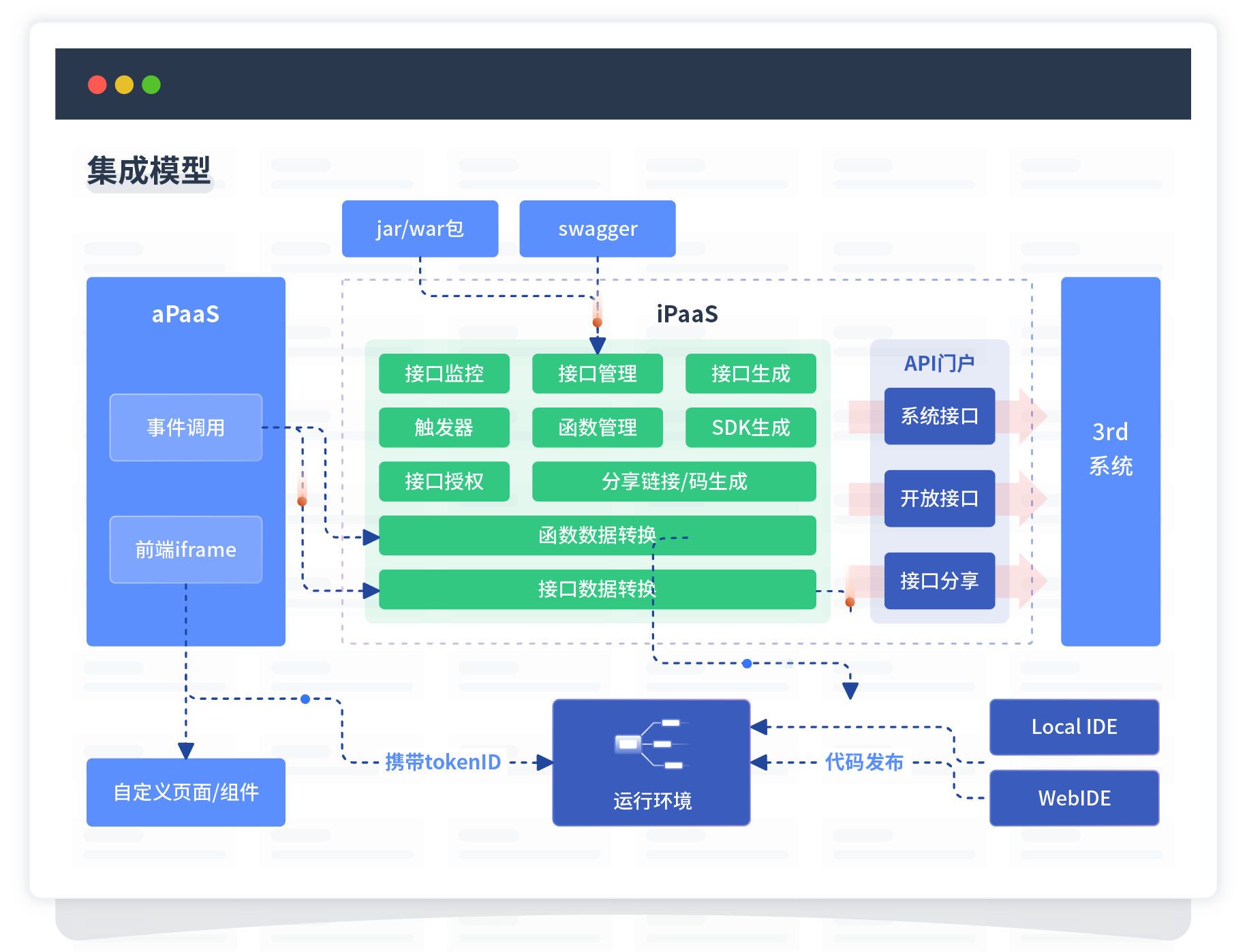 集成模型包括平台本身前、、后端能力的扩展,,,,也支持通过API门户和第三方系统进行交互。。。。