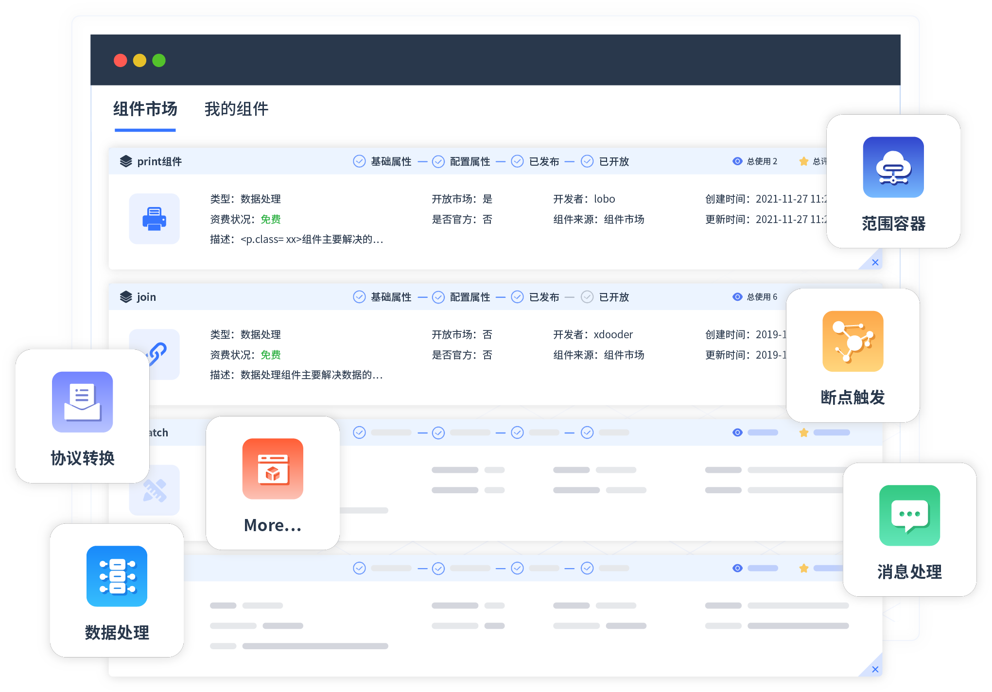 针对集成场景,,,美团钱包商家版提供组件市场,,,例如协议转换、、、、消息处理、、、文件操作等。。。除平台提供的组件外,,,,客户可以自定义所需组件。。。。