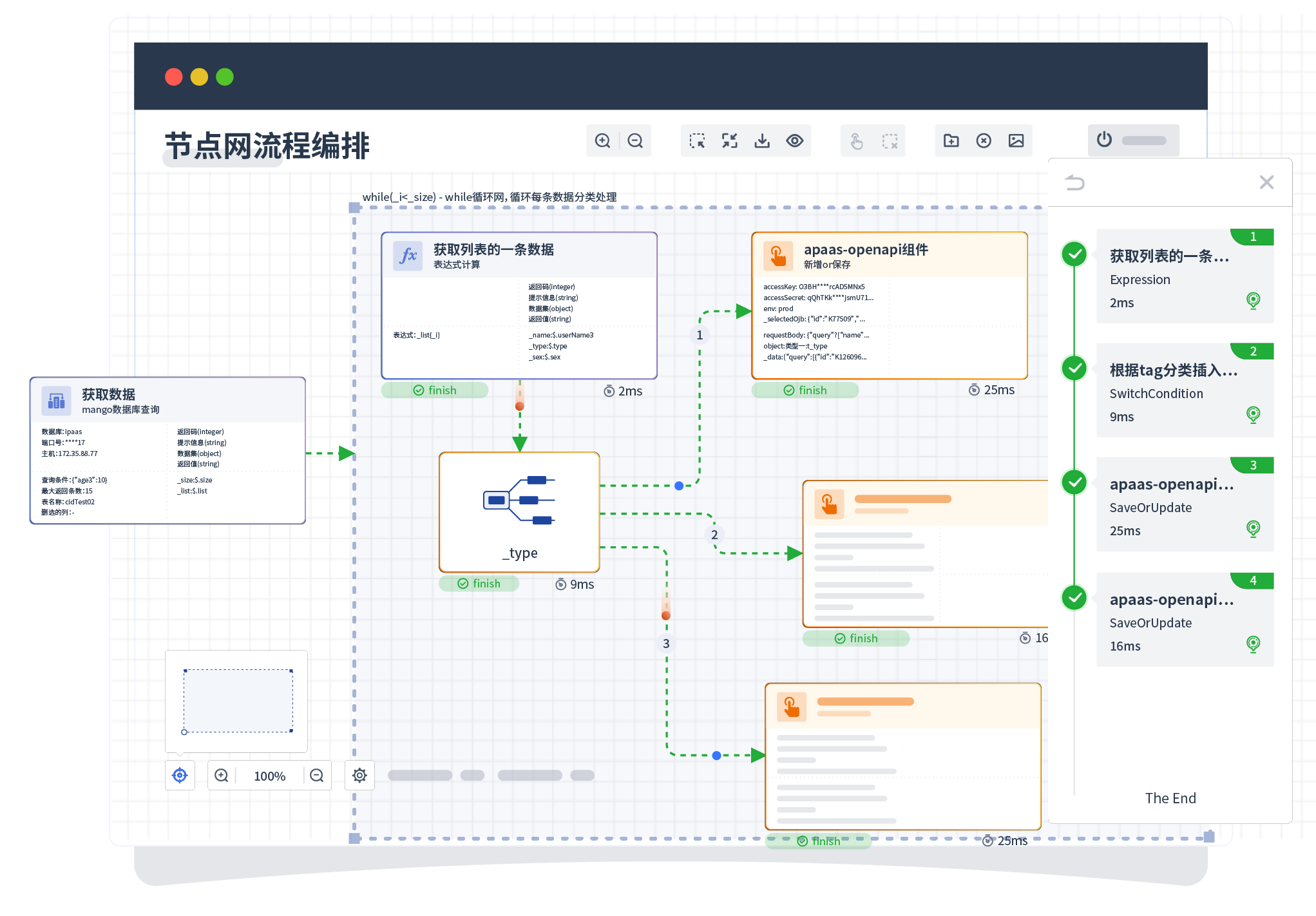针对集成场景,,组件定义后支持进行流程编制,,,,不同于传统代码方式,,,通过图形化展示,,,支持在线调试、、、日志查看和运行回放。。。