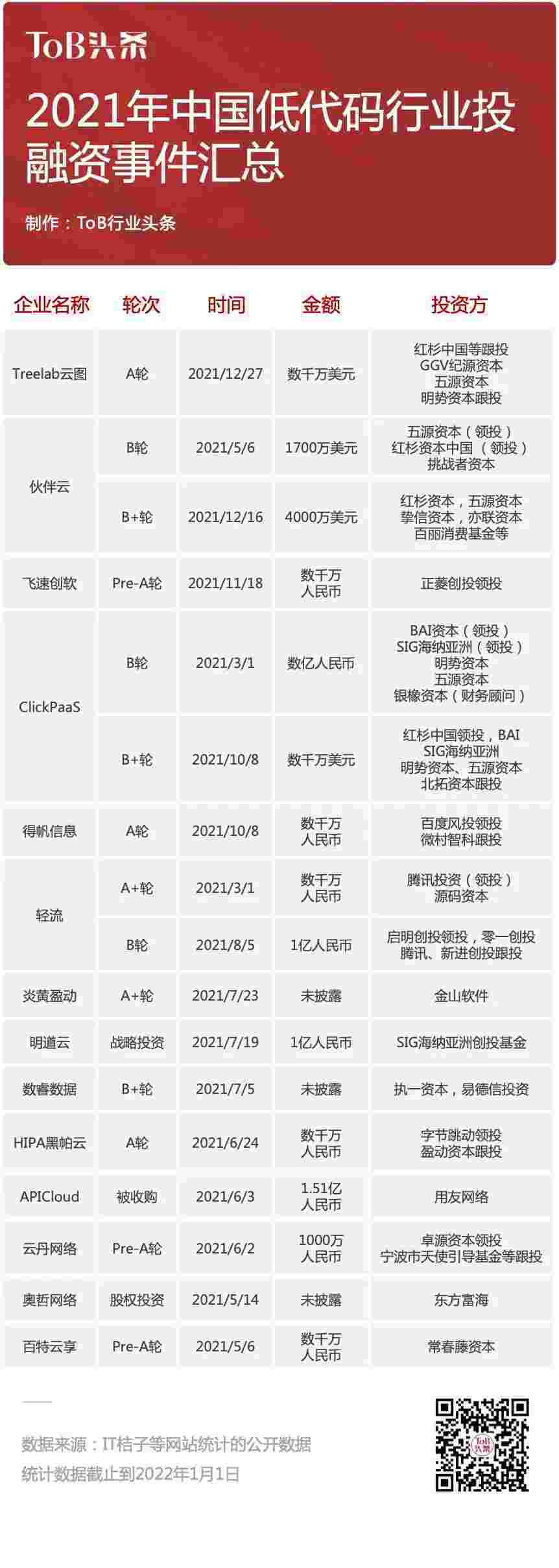 到2021年,,无/低代码投融资规模势头更甚,,,其中包括轻流两轮融资(A+轮数千万人民币,,,B轮近亿人民币)、、、、美团钱包商家版 两轮融资(B轮数亿人民币,,,,B+轮数千万美元)、、、百特云享数千万元Pre-A轮融资......